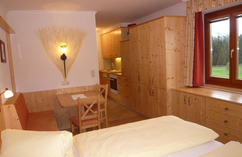 Apartment KLEINER PRIEL for 2-4 persons in 1. Floor Enjoy the wonderful view in this brightly furnished apartment in rural spruce wood style; A modern bathroom with shower / WC and the cozy living / bedroom with double bed, sitting area with satellite TV, radio leave nothing to be desired. It will be easy for you to cook your family in the fully equipped kitchen with dishwasher, refrigerator, ceramic hob, micro - everything there, just like home! Close the sliding door to the nursery with pull-out box-loft bed to sleep undisturbed. The spacious larch wood balcony allows a wonderful panoramic mountain view.