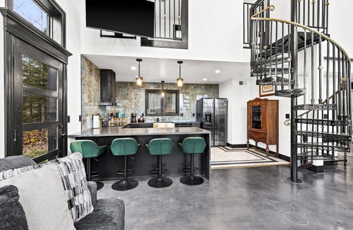 Stepping inside, you'll find yourself standing on gleaming polished concrete floors. What sets this cabin apart is the mesmerizing glow-in-the-dark aggregate embedded in the concrete. By day, the floors appear as a sleek and modern gray; by night, they transform into a starry expanse beneath your feet, casting an otherworldly ambiance throughout the living space. It's a magical feature that invokes a sense of wonder, perfect for stargazing indoors.