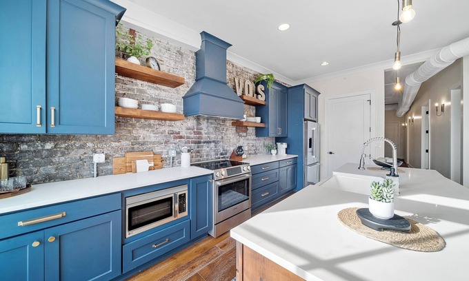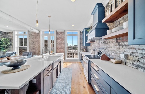 At Knoxtopia, you'll find original brick masonry walls, rich wood flooring, and upscale boutique finishings, all thoughtfully designed to create a warm and inviting atmosphere. The curated decor enhances the historic character of the space, making it a truly one-of-a-kind stay.