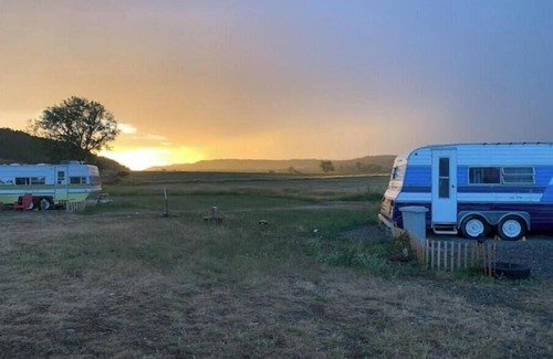 Glacier is one of three vintage campers at this 30-acre site. There is a shower house with dedicated stalls for each camper, and fresh herbs and tomatoes to pick from the garden.