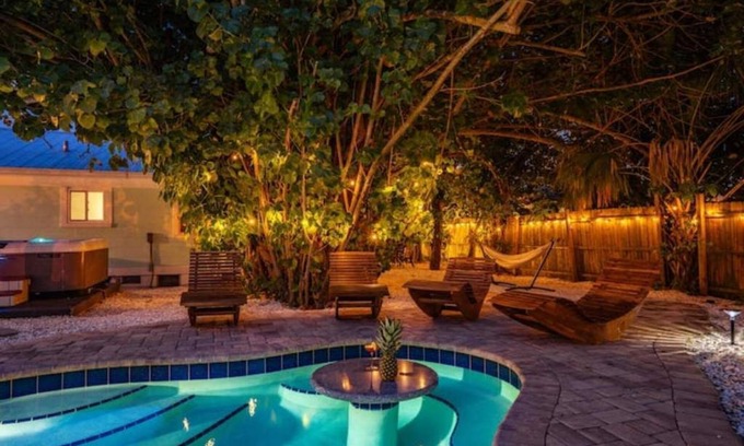 Off the Florida Keys, there's a place called Kokomo, that's where you wanna go to get away from it all...Relax with the whole family at Kokomo House! Bask in a lush, one-of-a-kind backyard with a HEATED pool/hot tub, outdoor dining, fire pit, lounge chairs, & hammock. Play bocce ball, cornhole, foosball, darts, board games, Ms Pacman or on the slackline swing set. 6 miles (10 min) from Anna Maria Island, 5 miles from IMG, 4.5 miles from LECOM Park and ½ mile from Manatee River boat ramp.