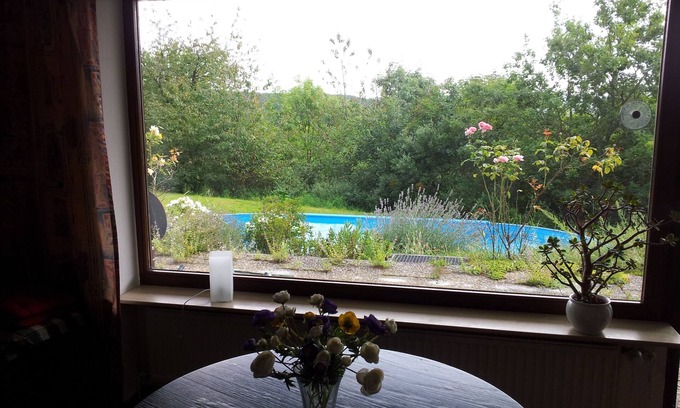Die Ferienwohnung (65qm) für 1-2 Personen ist eine Nichtraucher FeWo und befindet sich in ruhiger Lage am Waldrand, nahe dem Bayernturm, einem Aussichtsturm. Vom Bayernturm aus können Sie außerdem noch bis in die Rhön (ca. 45 km) und weit nach Thüringen bzw. bis Coburg blicken. Die Terrasse mit ruhiger Südhanglage bietet einen atemberaubenden Ausblick bis in den Steigerwald. Die Küche verfügt über eine Spülmaschine und Ceranfeld. Das Schlafzimmer ist mit hochwertigen Matratzen ausgestattet. Bad/WC. Ein besonderes Highlight ist der Kamin. Im naturbelassenen Garten können Sie sich am und im Pool (9,20m x 4,60m) vom Alltagsstress erholen. Suchen Sie Wohlfühlmassagen oder Therapie? Beides finden Sie in der Naturheilpraxis im Haus. Buchungen über einen längeren Zeitraum auf Anfrage möglich.