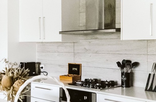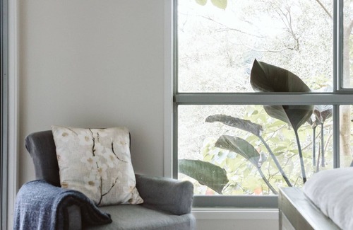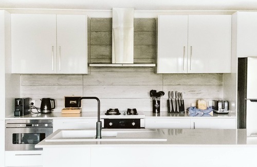 Kookaburra Lakehouse is a one-bedroom, one-bathroom house providing a modern, clean and quiet living space in a garden setting. The front door opens into the open plan kitchen-dining-lounge area. The kitchen has high end appliances, with ample cupboard and stone benchtop space.