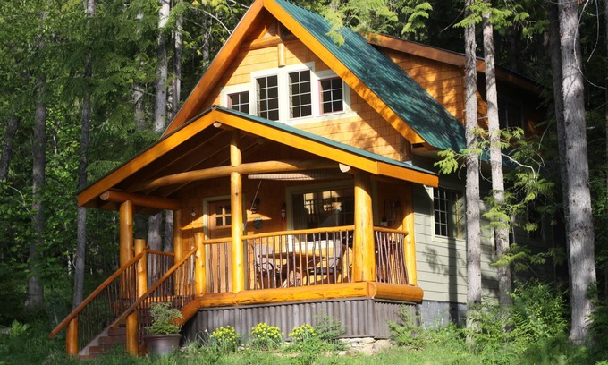 Custom-built cabin on the 50 acre historic Wedgwood Manor Estate in Crawford Bay, a few minutes from walking trails, a sandy public beach , Kokanee Springs Golf Course, boat launch and marina. The cabin is very clean, comfortable and well-equipped. It is tucked into the edge of the forest and overlook ponds, gardens and large expanses of emerald green lawns. A hiking trail from your back door leads you to a waterfall and a spectacular view of Kokanee Glacier.