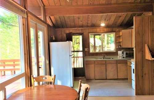 Stroll through the trees to find our 600 sqft waterfront Cottage with a private boat dock. Inside, you'll find 2 bedrooms (each with a Queen bed), a living room with a Queen sofa bed & foam topper, 1 bathroom with a washer & dryer, and a fully-equipped kitchen with a portable countertop dishwasher. Enjoy outdoor amenities including swings, a picnic table, firepit(free fire wood), and a spacious front deck with windows and glass doors that bring the outdoors in.
