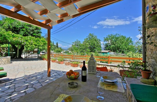 Entering the outside gate, you get into a stone paved garden, with parking space on your right side, a fixed BBQ further up and an old traditional stone table with sitting facilities, just outside the house's main entrance, underneath a beautiful pergola.