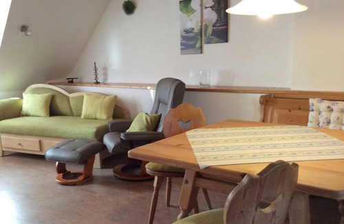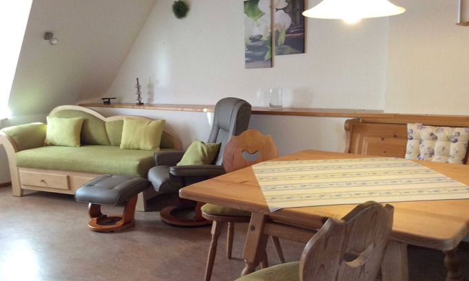 "Arrive us feel good" bright cozy apartment with well equipped kitchenette, dishwasher, ceramic hob, oven, etc. two bedrooms, shower-toilet own entrance, gr. Garden with old trees, barbecue hut, garden pond, all shops in town, new playground and sports field in the vicinity hiking -rad-paragliding