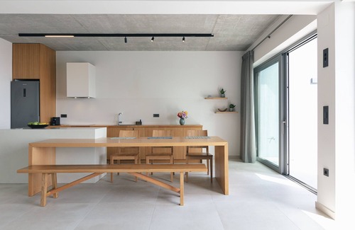 The 140m2 Krystallon West spreads in 2 levels and can comfortably accommodate 8 guests in its 4 bedrooms. The minimal design, simple lines, wooden furniture (several pieces of which are handmade creations of the owners), carefully selected details, ceilings of exposed concrete and earthy coloured palette of this contemporary dwelling add a touch of elegance one would expect of a modern holiday home.
