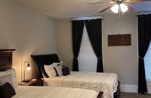 K’s Place Loft. Grandfathered in you will walk up 25 steps to your destination. Large Living area, dining, kitchen, Master Suite + bath. The Master Suite includes two queen beds with extra bedding provided in the dresser. Nightstand to share and an entertainment center with internet, movies and books. A walk-in closet with hangers for your attire. Full Bathroom with a tub/shower combo, fully stocked linens, towels and Hygiene products in case you forgot something, we’ve got you covered. The kitchen is fully stocked with treats, breakfast items and more. Next to the kitchen you will see the dining room with table and four chairs and games underneath. We also have games, books and activities for the youngens to enjoy in the bins. Wi-Fi is available and also movies if you wish. The living room has a couch sectional that also has a Full size bed pull out. We are pet friendly with a fee. We enjoy our loft and hope you do as well. There’s just something about being downtown and in the heart of a small town. Bonus…we own and run the restaurant right below with plenty to choose from on the menu and including the bar with many options. We also have a beautiful patio for you to enjoy if you choose to dine at our restaurant K’s Place.