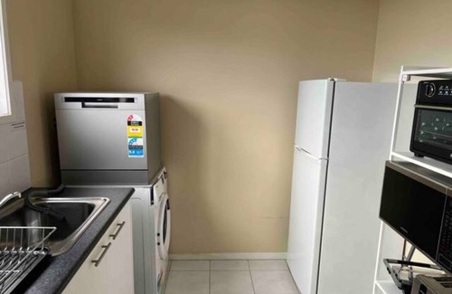 Equipped with a double hot plate, fridge, microwave, toaster, kettle, grill sandwich press, and regular kitchen utensils.
