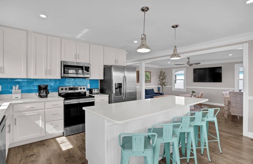 Inside, the open-concept living area invites guests to gather and unwind, whether it’s sharing stories after a day at the beach or enjoying a home-cooked meal in the fully equipped, updated kitchen. Thoughtfully designed with modern furnishings, this home balances style and function, ensuring a comfortable stay for every guest. The home comfortably sleeps up to 19 guests, making it an ideal destination for family reunions, group getaways, or multiple families traveling together.
