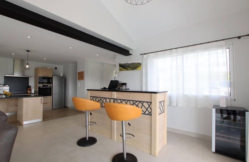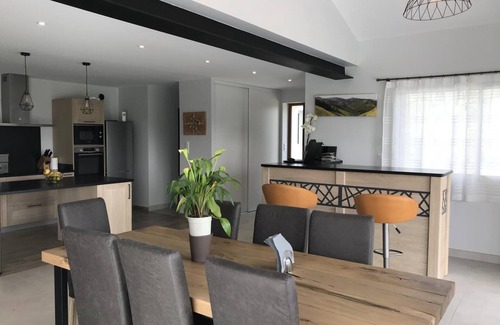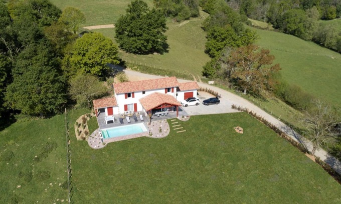 Detached, detached house with a private heated pool and a 6-seater jacuzzi. An old sheepfold, completely renovated, extended, and equipped with 4-star comfort. The covered terrace offers a magnificent panoramic view of the Basque Country mountains. Beautiful amenities include beds made, towels provided, heating, and cleaning included, so you can enjoy your vacation in this natural, green setting. On the ground floor: a large 70 m² living room bathed in light in a picture-postcard setting (very well-equipped kitchen - induction hob, oven and microwave, dishwasher, fridge-freezer, wine cellar), and a dining area opening onto the terrace. Living room (large flat-screen TV, Canal+ subscription, Bluetooth sound system, and CD player). 4G internet connection with good Wi-Fi speed. Bar area. Separate WC. Pantry (washing machine, dryer), attached garage (treadmill), Upstairs: 2 bedrooms, each with its own private bathroom (shower, sink, toilet) and TV: 1 queen-size bed and 2 twin single beds. Reversible air conditioning and heating included. 4 x 8 m swimming pool, 1.40 m deep, secured by a submerged cover. Salt treatment. Heated. Open from May to September. 1-WEEK MINIMUM RENTAL. The grounds are unfenced and open onto pasture areas. To avoid disturbing our neighboring sheep, please supervise your small pet (only 1 allowed per stay with a €3/day supplement). Gîte 2 km from the village, near the GR10 (hiking trail), 5 minutes from St-Jean-Pied-de-Port and 15 minutes from the Spanish border. Pets are welcome at an additional cost of €3 per day.