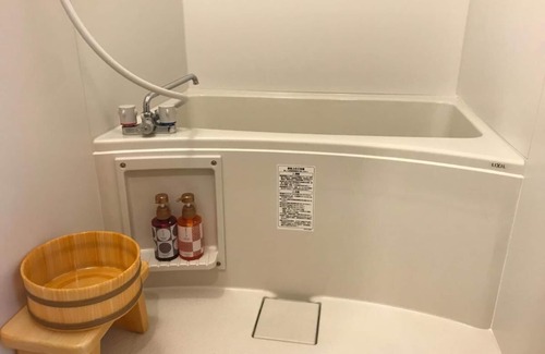 The private bathroom includes a Japanese-style deep soaking tub (furo) and shower, perfect for unwinding after a day of sightseeing. Complimentary toiletries—shampoo, conditioner, body soap—and a hair dryer are provided for your convenience. A separate toilet features a modern Japanese electronic bidet for added comfort.