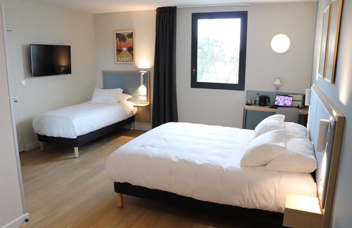 Kyriad Bordeaux Nord Sainte Eulalie offers 60 accommodations with coffee/tea makers and hair dryers. Each accommodation is individually decorated. Beds feature premium bedding. 43-inch flat-screen televisions come with premium digital channels. Bathrooms include bathtubs or showers with rainfall showerheads.