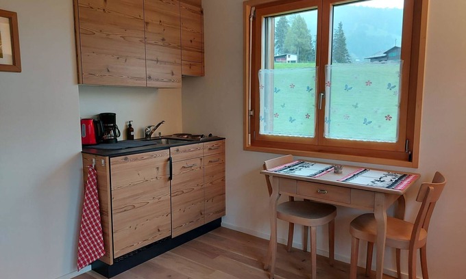 19 m2. More information by the provider: You stay in a new renovated studio (19m2) in alpine chic style, in a 2-family house on the 1st floor. The apartment has shower/WC, kitchen with refrigerator, coffee machine and kettle. Comfortable seating and a double bed. Storage room for skis/snowboard, charging station for e-bike. Garden sitting area by the house. The bus station is 50m away, with the bus you can go to the village or to the gondola station. The Chuenisbärgli can be reached with a short walk/5min. With the ski/snowboard you drive directly to your front door. In summer you start your bike tours and hikes directly at the house, also the via ferrata on the Engstligenalp along the waterfall can be reached by local bus, or with your car. The bakery is 50m away. In the apartment you enjoy an excellent view of the beautiful mountains.