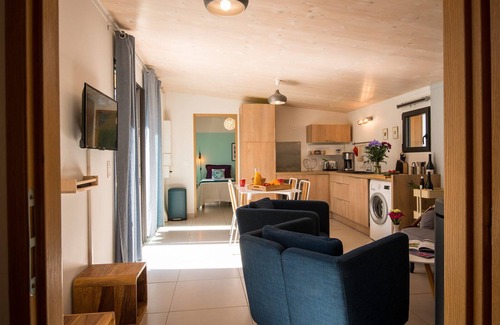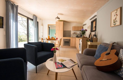 Located in Southern Ardèche, in a natural and calm environment, this 48m² gîte can accommodate 4 people. It has 2 bedrooms, one with a queen size bed (160cm) and the other with two single beds (90cm). Its kitchen is equipped with quality household appliances: fridge, dishwasher, washing machine, microwave, toaster, filter coffee maker. The swimming pool is shared with the 3 other lodgings which constitute this small holiday domain.