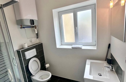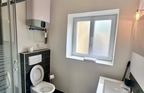 - Une salle de bain avec douche, sèche serviette, et toilette.