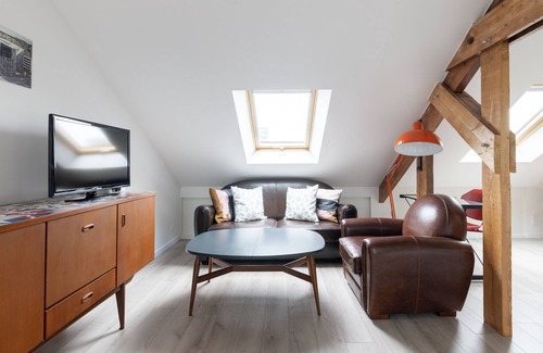 As its name suggests, the apartment is located at the top of a small 4-storey building (without elevator) dating from the 19th century, in a quiet street in the city centre, and enjoys a very beautiful view over the rooftops of Rennes.