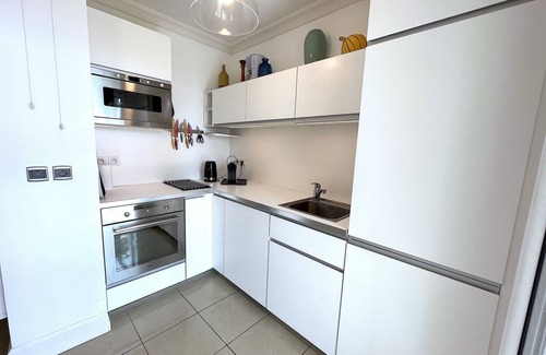 Perfectly located in front of the sea, in a modern residence with swimming pool, on the 1st french floor, the apartment is decorated with a lot of taste. Offering you all the comfort you are looking for, the apartment has a beautiful bedroom with storage space and an adjoining bathroom with shower. The living room is bright with open kitchen, fully equipped: coffee machine, fridge, toaster, kettle, oven, microwave, washing machine, dishwasher, dryer. Wifi internet throughout the apartment and cable TV with foreign channels. The apartment is fully air conditioned. You can enjoy a breathtaking view from the terrace. Everything has been planned so that your stay is as perfect as possible.