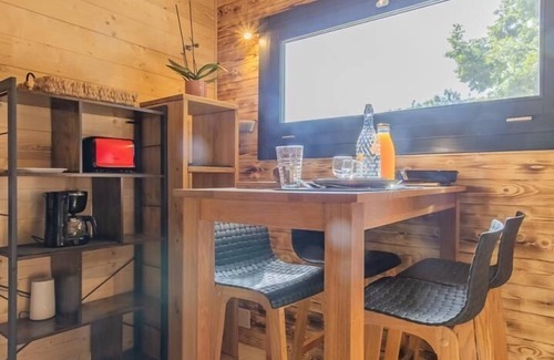Detached wooden frame chalet on 2 levels. Ground floor: living room-kitchen (2 gas burners, combined microwave oven, wood stove with integrated oven, a high table with 4 bar chairs), lounge area (Smart connected TV), a shower room (shower, 2 basins and WC), sheltered terrace with wood-fired Nordic bath. Upstairs: 1 bedroom (1 double bed 160x200 cm), mezzanine with sleeping area under the roof (1 double bed 160x190 cm) and relaxation area, opening onto the terrace. Total floor area: 48 m² attic parts included. Land with forests on 5ha. Laundry room common to the 3 chalets (washing machine and dryer) in a small chalet next door. 2 km from Arith, at the end of a 1 km dirt road, on the vast property comprising the main house of the owners offering guest rooms, are these 3 wooden chalets 100 meters apart. Built with ecological materials, favoring renewable energies, this wooden chalet is distinguished by its originality with its wood stove for heating and its integrated oven to rediscover the pleasure of a kitchen of yesteryear.