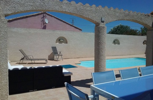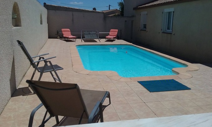 Argeliers 20 km from Narbonne: Single-family house "L'Argeliésoise", 2 storeys. In the resort, 200 m from the centre, in a quiet position. Private: garden 100 m2 (fenced), swimming pool angular (4 x 7 m, seasonal availability: 01.Jun. - 30.Sep.) with internal staircase and alarm system. Terrace, barbecue house, pool maintenance by the owner/gardener. Shop, grocery 300 m, supermarket 1 km, bakery 300 m, bus stop 500 m, railway station "Narbonne" 20 km, sandy beach "Narbonne Plage" 25 km. Nearby attractions: Canal du Midi, Visites domaines viticoles, Simulateur chute libre Lézignan 24 km, Narbonne 20 km, Carcassonne 50 km, Espagne 115 km. Hiking paths: Massif de la Clape - Narbonnais, Zones Naturelles d'interet ecologique, Pistes cyclables. Please note: car recommended. Baby equipment on request (included). The owner does not accept any youth groups. Owner lives in separate semi-detached house.