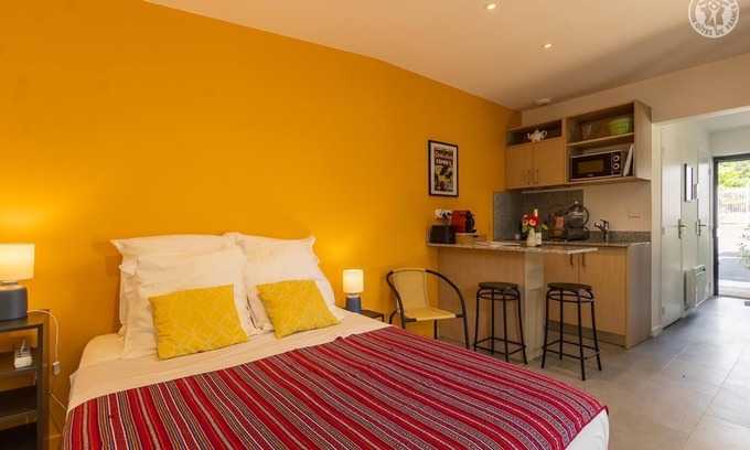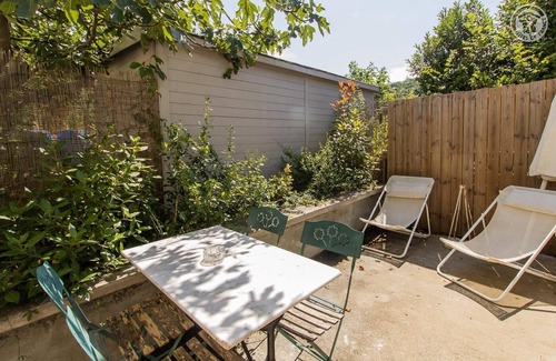 Studio with independent access located on the ground floor comprising an entrance, a bathroom (shower), separate WC, a living room-kitchen (combined microwave oven) with 1 double bed 140x190 cm opening onto a closed terrace . TV with free Molotov / Disney / Netflix apps. Private parking in the fenced property. Possibility to store bicycles in the shed in common with the owner. Former personal workshop of the owner's grandfather, converted into 2 adjoining gites, attached to the main house. Residential area on the heights of Chambéry (line 4 of the Chambéry urban network stop 100 m away). Studio pleasantly arranged and equipped for 2 people with all-inclusive services. Terrace in an enclosed courtyard, with table and deck chairs, facing south.