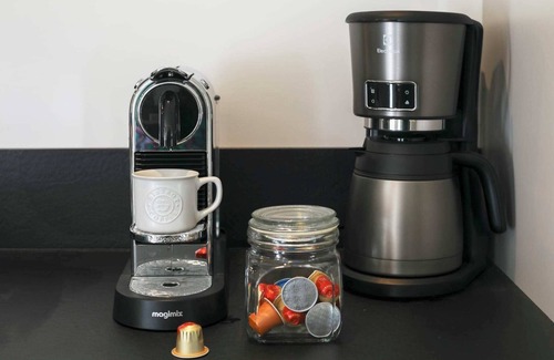 • Cuisine spacieuse avec une grande table pour partager un bon repas et entièrement équipée : four, cave à vin, micro-onde, machine à café