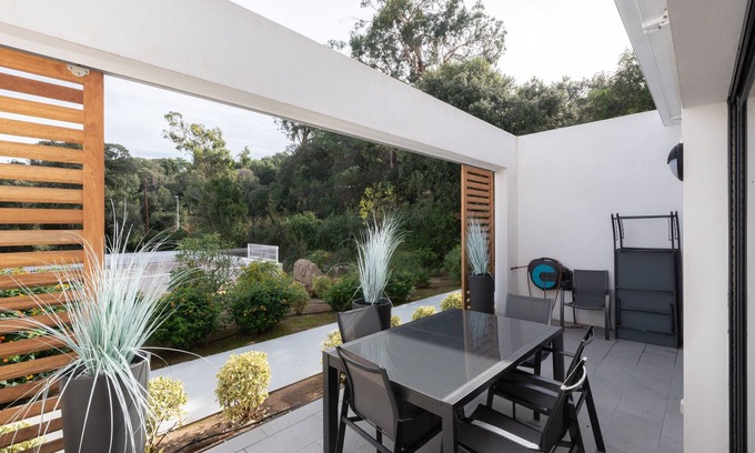 Cocoonr/Book&Pay invites you to come and enjoy the Isle of Beauty by staying at l'Ebène! Just 30 minutes from Ajaccio, this beautiful, fully-equipped 50 m² ground-floor flat can comfortably accommodate up to 6 people. It has all the comforts you need for a successful holiday: a lovely terrace with sea view, fully equipped kitchen, two bedrooms, bathroom with walk-in shower and basement parking space. Bed linen and towels not provided, but can be hired.