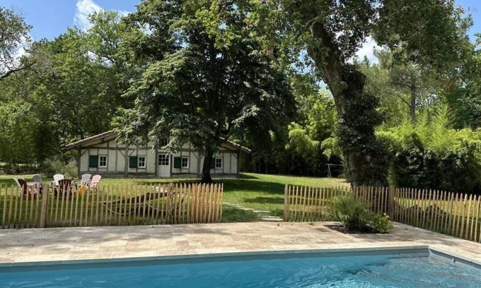 Welcome to Sabres, in the heart of the Landes de Gascogne Regional Park, where the forest stretches over 16,000 hectares. Its healthy air invites you to take walks and the Marquèze district, which has become the Ecomusée de la grande Lande, offers visitors the magic of its tranquility and art of living. Board the century-old train to discover the riches of a heritage and know-how of yesteryear. Nestled in a private enclosed airial and only 40 km from the ocean, we welcome you to this authentic 19th century Landes house, entirely rebuilt identically with natural eco-construction materials and techniques. Earth and lime plasters, half-timbering and beams in Landes pine, thermodynamic boiler, pellet stove... have been used to best integrate our eco-lodge into its environment. You will enjoy a private swimming pool, 8x4 m, depth 1.20m to 1.50m secured by a fence in ganivelles and a roller shutter, usable from June to September and depending on the weather. This independent house fitted out on the ground floor with mezzanine is composed of a large living room, a fully equipped kitchen (dishwasher, fridge freezer), 3 bedrooms on the ground floor (2 beds 160, 1 bed 140), a dormitory room upstairs (4 beds 90), a bathroom (with bathtub, and shower) and 2 separate toilets, a private shower room in one of the bedrooms, a storeroom (washing machine). Sheets, household linen and WIFI are provided. Terrace with garden furniture and barbecue, bikes of all sizes available to be confirmed with the owner before arrival. PETS: possibility to come with 2 dogs maximum with supplement (8 € per day and per animal), beyond that agreement of the owners essential. CATS NOT allowed.