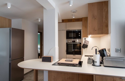 The 2 studios with an area of 17 and 18 m2 have a double bed 160*200, a fully equipped kitchen and a bathroom with walk-in shower, basin and toilet.