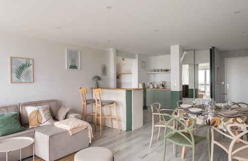 Cocoonr agency offers you, this charming 107 m² flat with Wi-Fi for rent in Rennes, which can accommodate up to 8 people. Located on the 23rd floor (with lift), it has a lovely 23 m² living room, fitted kitchen, four good bedrooms and two bathrooms (with shower and bath). Cleaning is included in the rental price and 4-star hotel-quality linen is provided (sheets, towels, tea towels). Your bed will be made up on arrival.
