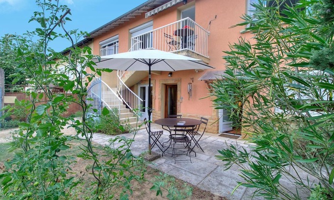 Welcome to L'Escale, in Trévoux, where you can savor the originality of the place. An atypical interlude. Discover your vacation home, with private relaxation areas in the cottage and common areas located below the garden. Let yourself be amazed by the owner's natural swimming pool: a live pool with fish and aquatic plants, for a refreshing, surprising, and completely exotic swim. Here, there's no chlorine or artificial blue, just nature in all its splendor... and the pleasure of reconnecting with an authentic environment. There are many discoveries to be made around the cottage. In Trévoux, stroll through the medieval streets. This former capital of the Principality of Dombes charms with its picturesque cobbled streets and artists' studios. And what if the invitation continued through the many walks and bike rides? Explore the Voie Bleue and escape along the peaceful riverbanks, offering an ideal setting to breathe and enjoy the outdoors. Have you heard of Ars-sur-Formans? Its famous sanctuary and the history of the Saint-Curé of Ars, Jean-Marie Vianney, offer a cultural and spiritual excursion. Upon returning from your "Stopover," this two-story house offers a unique touch. The main living area is located upstairs, along with a bedroom for two. A lounge area with an ornamental fireplace is available for cozy evenings (the fireplace doesn't heat, but it sets the mood). Two bedrooms with separate entrances are located on the garden level. Technical description: 1st floor accessible by an exterior staircase - semi-open kitchen to the living room, lounge, bedroom (two 90x200 cm beds that can be joined together) with a private bathroom. Ground floor: 2 bedrooms (1 queen-size bed, 1 single bed, 1 queen-size bed). Private bathroom. Pack light: beds made upon arrival, towels and linens, utilities, and cleaning are all included.