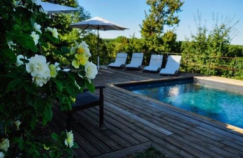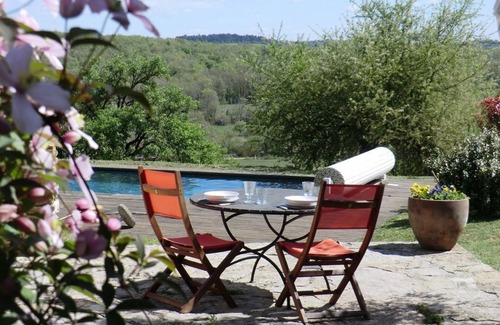 Guests can sit on the terrace overlooking the pool, lay by the pool and also have access to lawns, table tennis and play ground that are shared with 3 other gites on the large property.