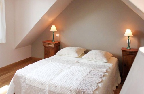 "L´Etang", 4-room house 80 m2 on 2 levels. Tasteful furnishings: living/dining room with sloping ceilings, ceiling height 207 cm with dining table and TV. Exit to the terrace. 1 room, ceiling height 207 cm with 1 french bed (160 cm), hand-basin, separate WC and shower. Kitchenette (oven, dishwasher, 4 gas rings, toaster, kettle, freezer, electric coffee machine). Upper floor: (open staircase), 1 room with sloping ceilings with 1 french bed (160 cm). 1 room with sloping ceilings with 2 beds. Shower, sep. WC. Electric heating. Parquet floors. Patio. Terrace furniture, barbecue (portable). Panoramic view. Facilities: washing machine, children's high chair, baby cot. Internet (WiFi, free). Please note: non-smokers only. Maximum 1 pet/ dog allowed.