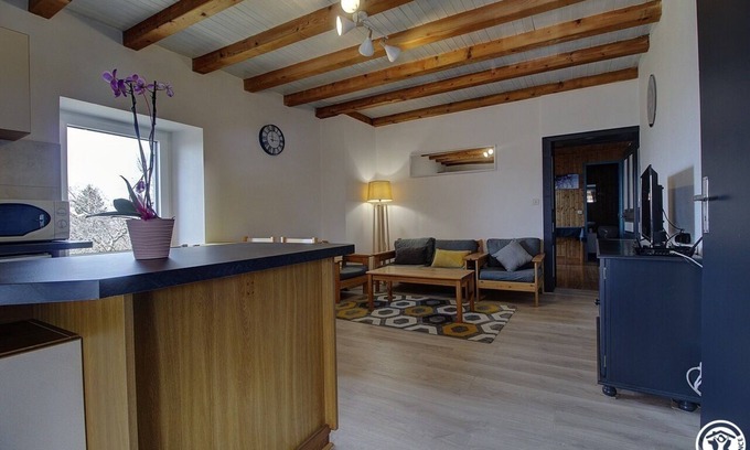 Ideally located to recharge your batteries both in summer and winter, this 2-level gîte (80 m²), completely renovated in December 2021, adjoins the owner's house, on the 1st floor with access via a few steps. On the 1st level: You will access the living room via the terrace, which is composed of the kitchen open to the dining area and the lounge area. 1 bedroom with 1 double bed, shower room with WC. Upstairs: 1 bedroom with 3 single beds, a second shower room with WC. Central heating. Barn for storing skis, bicycles and motorcycles. Private terrace, garden furniture, barbecue, enclosed land (except in winter) owned by the owner. Children's games. In the heart of the Haut Jura Natural Park, multiple discovery activities for the family. GR9 hiking, mountain biking, caving, archery, cross-country skiing, adventure course, multi-sports hall. No business stays.