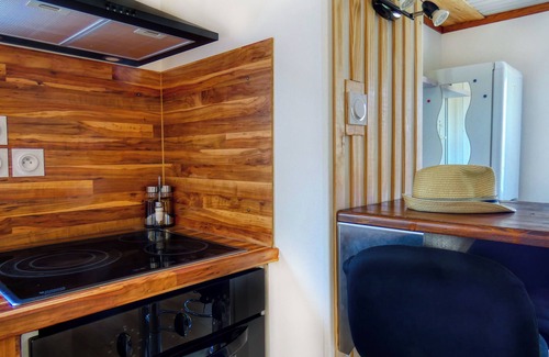 - A bright living room with lounge (140cm sofa bed, armchair, TV, wifi, fan), fully-equipped kitchen (ceramic hob, oven, fridge, freezer, dishwasher, microwave, coffee machine, kettle, toaster) and a dining area around a bar for 4 people.