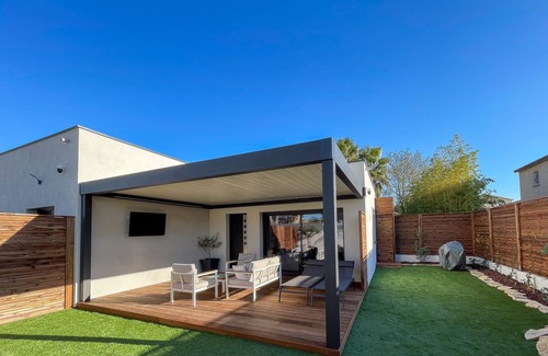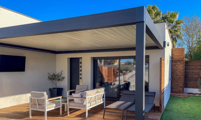 A 25 m² wooden terrace with a stylish bioclimatic pergola, complete with a spacious outdoor lounge and a TV for cozy evenings.