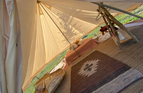 In this tent you'll find a nomadic atmosphere with its terracotta colors, a double bed 160x200 and 2 single beds 90x200, a handcrafted closet, solar lamps or USB plug-in lamps, and an electrical outlet.