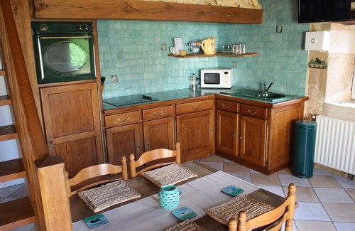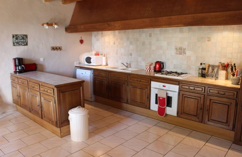 The farmhouse boasts an open plan living room and big farmhouse dining kitchen which is perfect for making self-catering a sociable affair. The well-equipped kitchen includes an oven with gas hob, microwave, fridge-freezer, coffee maker and dishwasher. A washing machine and ironing facilities can be found in the utility room. As well as the main lounge equipped with TV, DVD player and music dock, youngsters have their own snug to watch TV or DVD’s, play Wii games, board games or set up the table football. Toys and books for younger children are also provided. The master double bedroom in the farmhouse is on the ground floor and features a canopied, solid wooden bed and a decorative stove. The second double bedroom, with a wrought iron bedstead, is on the first floor, along with two twin rooms with antique wooden beds. The farmhouse has a bathroom, a shower room and two wcs. The gîte has its own dining kitchen, with an oven, electric hob, microwave, fridge, dining table for four and a wall-mounted TV. The master bedroom has a double wrought iron bed and the second bedroom has twin wrought iron single beds. The gîte has its own shower room and wc. The farmhouse and the gîte have the rustic charm and character of stone walls and beamed ceilings throughout.