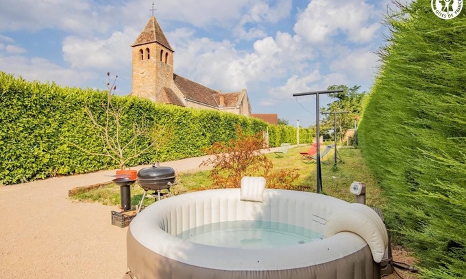Authentic imposing traditional barn of character from the 18th century, steeped in history & carefully restored, adjoining an elegant church in the heart of a peaceful & picturesque little Burgundian village, perfectly preserved. In the middle of gentle rolling countryside, on the borders of Chalonnais and Tournugeois-Clunisois, on the edge of two vast wild forests (the Bois du Grand Bragny & the Forêt domaniale de la Ferté / to explore during relaxing walks or mountain bike rides), in the hollow of the bucolic Grosne valley (& its nearby fish-filled river), magnificent preserved setting of nature & greenery combining hillsides of vineyards & beautiful hedged meadows dotted with ponds, protected in "Natura 2000 Zone" & ZNIEFF for its rich fauna & flora ecosystems. Very comfortable gîte with atypical architecture. Ultra spacious. Exceptional living room of 100m². Warm country character with contemporary accents combined with the totally exotic soul of the place (stone walls & half-timbering including a sculptural "openwork skeleton", beams & framework... original). Lots of charm & character. Pleasant enclosed courtyard, planted & flowered, with a terrace completed by a garden nestled at the back of the house, including a large gravel terrace, a 4-seater outdoor spa, natural pétanque court & small garden. Composition: Semi-detached village house. Wood pellet stove + electric heating. Air-conditioned floor. Wifi (fiber). Ground floor: living room-kitchen-lounge, 2 bedrooms (double bed 140x190cm in each), bathroom (shower), separate toilet, laundry room. 1st floor: 3 bedrooms including 1 on a mezzanine (double bed 140x190cm) and 1 atypical (double bed 140x190cm + raised single bed 90x190cm) opening on the "second day" onto a 3rd (double bed 160x200cm) with a private bathroom (bath + shower), separate toilet. Terraces + small garden + outdoor spa (4 p.) in July/August + natural pétanque ground + private parking. Amenities including supermarkets 10 km away.