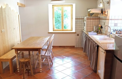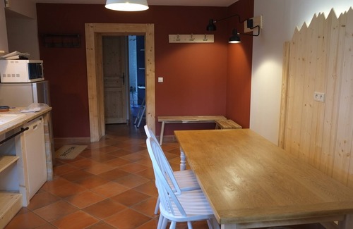Lobby with coat rack and benches directly overlooking a kitchen with a large family table (8pers), and fully equipped (oven, microwave, toaster, kettle, fridge, freezer, dishwasher, induction cooking, and all the necessary to cook).