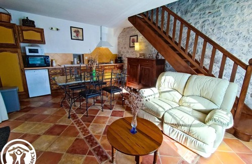 Ideally located 5 mn from St Cirq Lapopie, one of the most beautiful villages in France, in the Lot and Célé Valley, close to famous sites such as Cahors (20mn), Rocamadour (1h00), the cave of Pech Merle (30 mn) Figeac...La Bergerie is a small independent gite, all comfort, fitted out in an outbuilding of a farmhouse, on a sheep farm in activity and guest rooms. From the terrace, you can enjoy the hilly countryside, to the sound of the sheep's bells ! La Bergerie's plusses : reversible air-conditioning for a temperate gite in all seasons, bed and bathroom linen included and internet access .Farm yard, parking next to the accommodation, access on the same level by a covered terrace, garden furniture and bench. Large living room opening onto the meadow through a bay window. 2 armchairs, large-screen TV, wood stove, spacious kitchen area, fully equipped with plenty of storage space. Upstairs, a large mezzanine bedroom with 160cm bedding, storage cupboard, shower room with large shower, mirror washbasin, storage space, hairdryer, separate toilet. Private garden not closed, small outbuilding with washing machine, barbecue storage and 2 garden armchairs. According to availability, we can lend you a Red Castle pushchair and its cosy transport, cocodo cradle (up to 9 months), cot, bathtub, high chair.