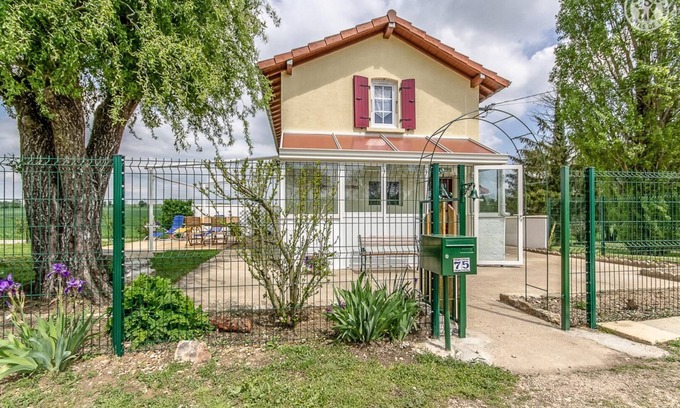 Authentic 19th century gatehouse steeped in carefully restored history, endowed with an income from a literally exceptional situation since it is nestled on the very route of the greenway (cycle path on the old Chalon railway line in Lons -le-Saunier). Nestled in the countryside on the edge of fields & meadows, in a delightful unspoiled natural and agricultural setting, the cottage adjoins a vast forest (footpath) at 4.5 km from the charming, typical and commercial village of St-Germain du Plain (all shops and services on site). Spacious gîte with very good comfort. Warm, contemporary country character combining the cozy atmosphere of a comfortable country house, careful heritage restoration and the exotic atmosphere of an old house. Very charming. Very cozy. Complete quality equipment. Enclosed and flowery garden with a swing, a shed (both playhouse and bicycle room), a large exposed & shaded terrace, a pleasant relaxation area under a pergola and a second terrace more intimate (exposed is ideal for breakfast), completed by a large tree-lined garden (not enclosed) adjoining the gîte. Beautiful open view over the surrounding countryside. Composition of the gîte: Detached house on 2 levels. Wireless. Central heating (gas). Ground floor: veranda, living room-kitchen-lounge (2-p. 160x190cm "rapido" convertible sofa in an intimate private alcove with door), bathroom (shower / wc). 1st floor: 2 bedrooms (double bed 160x200cm / 2 single beds 90x190cm which can be twinned into a double bed 180x190cm) including 1 with private bathroom (shower), separate toilet. Enclosed garden + land. Double terrace. Private parking. Secure bicycle room. TGV stations: Creusot 49 km, Mâcon Loché 64 km.