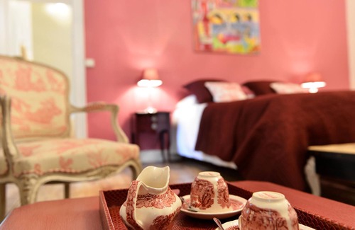 All charm and elegance, with its Bordeaux mahogany antique wardrobe from the eighteenth century, its little Louis XV style desk , and its refined decoration in shades of pink and white Toile de Jouy ...
