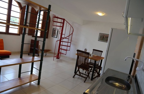 The apartment has two levels, the upper one is the bedroom and the bathroom and the lower floor is the living room and the kitchen.
