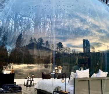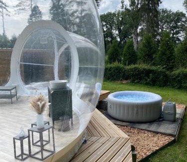 La bulle du Bon'Heure provides a hot tub and free private parking, and is within 12 miles of Barvaux and 12 miles of The Labyrinth of Barvaux-sur-Ourthe. The property is around 12 miles from Adventure Valley Durbuy, 17 miles from Hamoir, and 18 miles from Sy Train Train Station. Staff on site can arrange a shuttle service. Towels and bed linen are featured in the luxury tent. The property has an outdoor dining area. Guests can also relax in the garden. Anseremme Train Station is 21 miles from the luxury tent, while The Feudal Castle is 22 miles away. Liege Airport is 30 miles from the property.