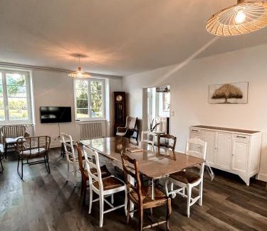 Providing a garden, LA BUTTE - Maison de vacances Avranches avec vue sur le Mont Saint Michel provides accommodations in Le Val-Saint-Père. This property offers access to a balcony, table tennis, free private parking, and free Wifi. The vacation home also offers facilities for disabled guests. Offering a terrace and garden views, the spacious vacation home includes 4 bedrooms, a living room, flat-screen TV, an equipped kitchen, and 3 bathrooms with a walk-in shower and a bidet. Towels and bed linen are featured in the vacation home. The property has an outdoor dining area. Guests can make the most of the warm weather with the property's barbecue facilities. For guests with children, the vacation home offers indoor and outdoor play areas. Guests at LA BUTTE - Maison de vacances Avranches avec vue sur le Mont Saint Michel can enjoy darts on-site, or go hiking or walking tours in the surrounding area. Scriptorial d'Avranches, Musee des Manuscrits du Mont Saint Michel is a 15-minute walk from the accommodation, while Granville Train Station is 16 miles away. Rennes–Saint-Jacques Airport is 55 miles from the property.