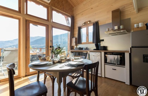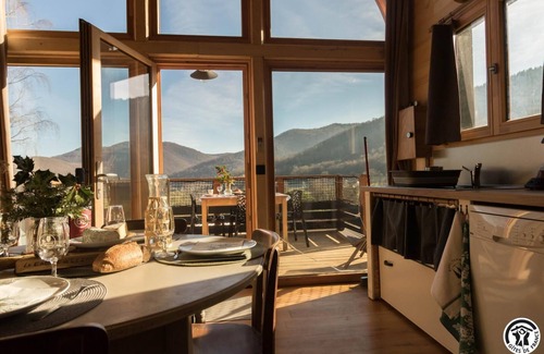 Treat yourself to a dream stay in this charming and very bright accommodation, located in the beautiful Pyrenean village of Sauveterre-de-Comminges. Karine and Jérôme, the owners, offer you an enchanted cabin for your vacation. They have put all their heart into developing this accommodation and will be very happy to welcome you! The outcome of this project also highlights their eco-responsible approach, since the cabin comes from a supplier in Dordogne, the wood for the fittings was purchased through a short circuit, and the insulation is made of wood and plant wool. . New service: by appointment, relaxing or invigorating massages with Tonny, a qualified and experienced masseur! Facing the mountains, sipping tea from your terrace, you can plan an active vacation from the gîte: the GR78 passes a few hundred meters away; the peak of Gar and Cagire are very close; 600km of mountain bike route including several departures from the village; Saint-Pé-d’Ardet lake is 7km away; Saint-Bertrand-de-Comminges (one of the most beautiful villages in France) at 11.7km, Montréjeau (train station, swimming lake and golf course) at 15.7km; the Mourtis ski resort is 40 minutes away and that of Luchon 35 minutes away. Spain 35 minutes away. Farm sales possible 400m away (cheese, meat, etc.), Sauveterre market on Sunday morning and Aspet (14.8km) on Saturday. You can do your shopping in Loures-Barousse (there is also a laundromat) 8km away. After climbing the steps of the entrance staircase, you will have access to a south-facing terrace, and, inside, on the first level: a dining area, an integrated kitchen, a living room and a bathroom/ WC; and on the second level, a sleeping area on the mezzanine with 2 double beds 140*190cm. There is no washing machine in the gîte but the owners will be happy to wash your clothes. The outdoor area is fenced, there is also parking on the property, a bowling alley and a shed to protect your bikes and skis.