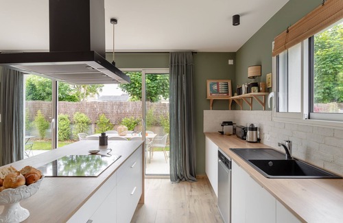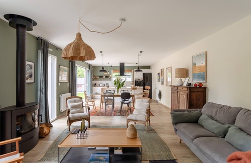 The Cocoonr/Book&Pay agency offers this charming 115 m² house for rent in the commune of Lancieux, less than a kilometer from the beach, with wifi, which can accommodate up to 8 travelers. It features an attractive 42 m² living room (with wood-burning stove), fully-equipped kitchen, four bedrooms, two bathrooms (with shower) and a 150 m² garden. Housekeeping is included in the rental price and 4* hotel-quality linen is provided (sheets, towels, tea towels). Your bed will be made up on arrival.