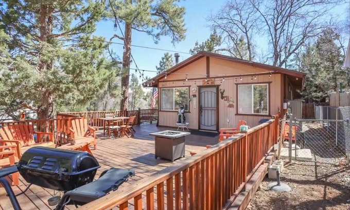 SAME CABIN, NEW LISTING DUE TO ACCOUNT CHANGE - Cute and cozy 2 bedroom 1 bath cabin. Huge patio with a propane fire pit and bbq with plenty of sitting room to enjoy the outdoors. Completely fenced in yard to allow your four legged fur babies to play outside. Just a short walk to the National Forest for mountain biking, hiking, and sledding. Super quiet neighborhood. Cabin is beautifully decorated with a mountain theme. Everything you will need except your toothbrush. IG: LaCabanitaBigBear